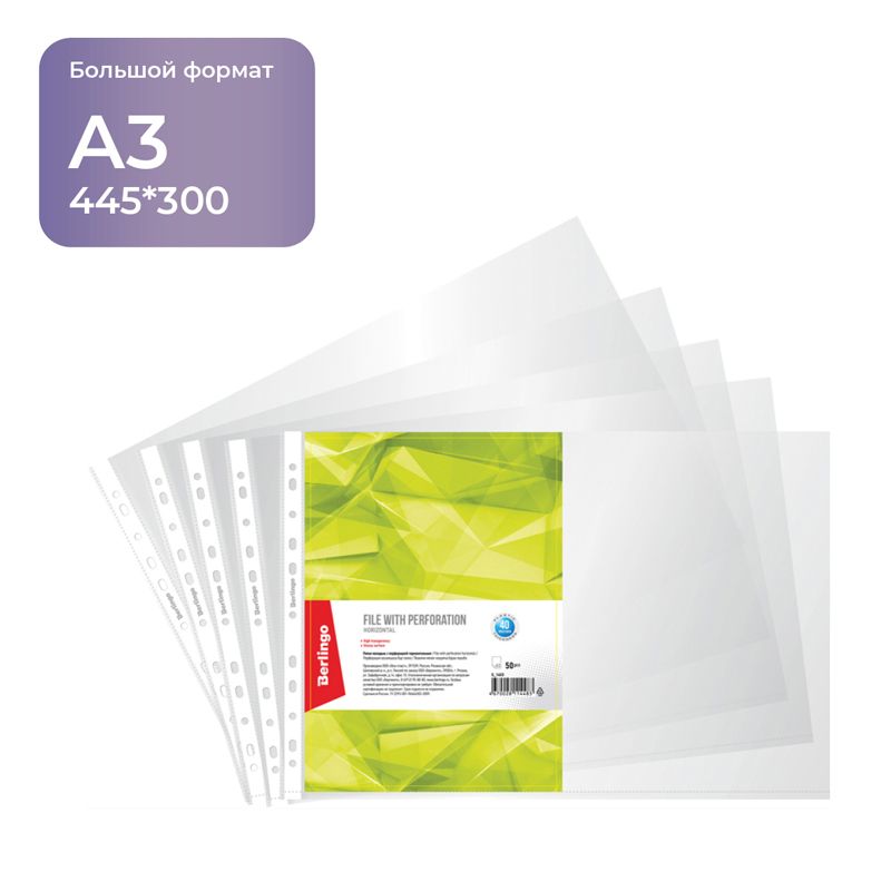Глянцевые прозрачные файлы-вкладыши Berlingo формата А3 размера 445*300 мм имеют универсальную перфорацию для хранения документов формата А3 в любых папках. Горизонтальная ориентация, толщина пленки 40 мкм, вместимость файла до 50 листов бумаги. В упаковке 50 штук.
