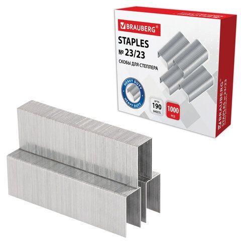 Заточенные сверхпрочные стальные скобы серебристого цвета для степлера BRAUBERG размером № 23/23.